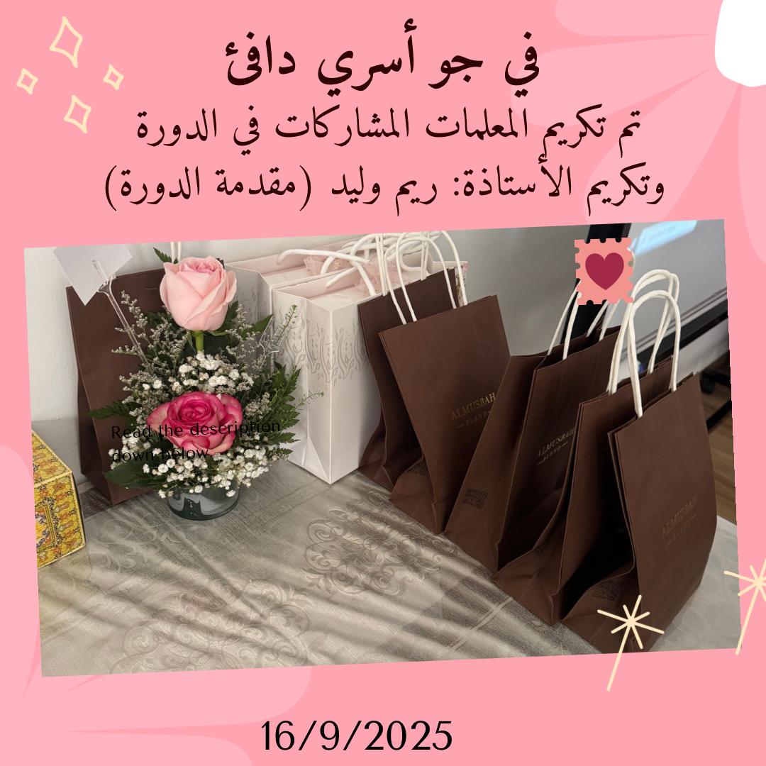 تم اليوم الثلاثاء الموافق 16/9/2025 تكريم معلمات المركز المشاركات في دورة فن إدارة الحلقات من خلال برنامج التيمز والتي أقامتها الأستاذة :ريم وليد