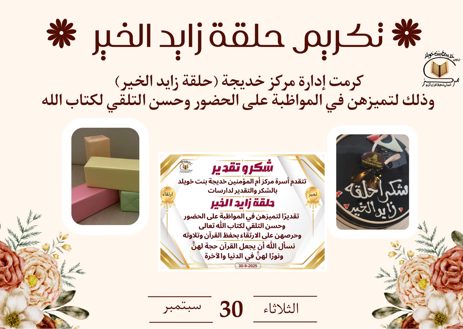 كرمت إدارة المركز اليوم 30-9-2025 حلقة زايد الخير لتميزهم في المواظبة على الحضور وحُسن التَلقي لكتاب الله